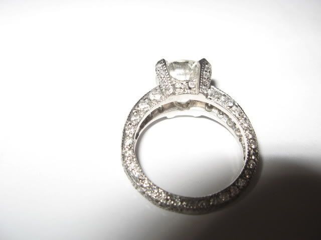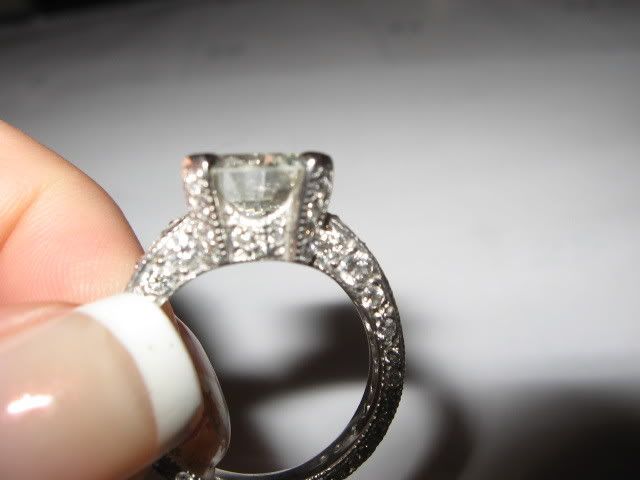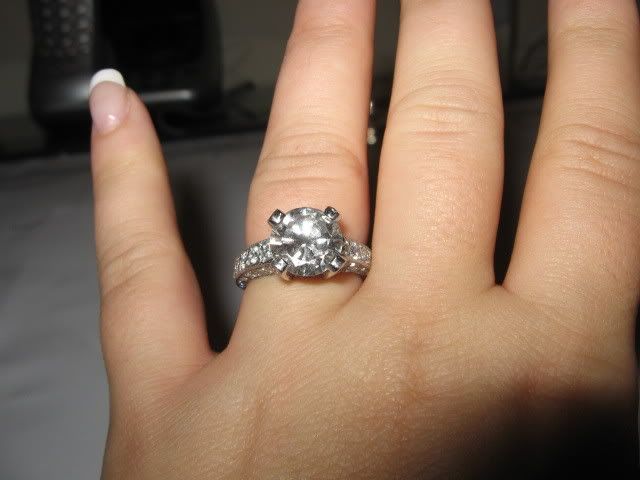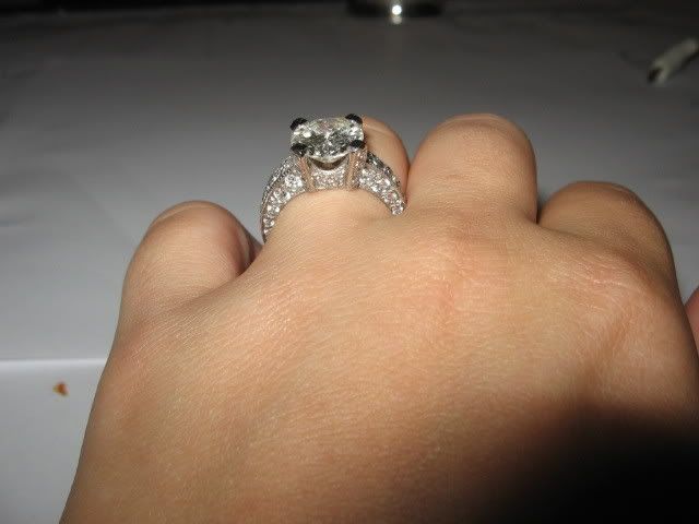 When we first found out i was pregnant in June he asked me very seriously if i would love him forever. My answer was a thousand times yes. He told me he would very much like to get married before the baby was born. I agreed and started planning the wedding. There was never a real proposal until Thursday night. He is a Jeweler and was adamant that i have an amazing ring and it took a while to find the right diamond. Well he took me to Morimoto and popped the question 1 week and 1 day before we are scheduled to be married in Punta Cana. This ring was sooo worth the wait! He picked the center stone (3.29 carat round cut) I picked the setting (Platinum with another 2 carats of side stones) My favorites (besides the center) are the 4 little ones the go up the 4 prongs. I never in my life thought i would ever own something so amazing. I am so blessed and I can't wait to marry him and wear this ring forever! We leave tomorrow and i promise to come back with some more wedding pictures.