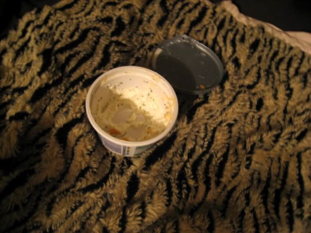 so i had tub of the whipped kind of philly cream cheese, which i was enjoying the first of with some nacho doritos. i ate maybe 3 tablespoons of the stuff, put the lid back on, and set it next to the couch on the end-table-thing while i went to check my emailorsomethingorother.