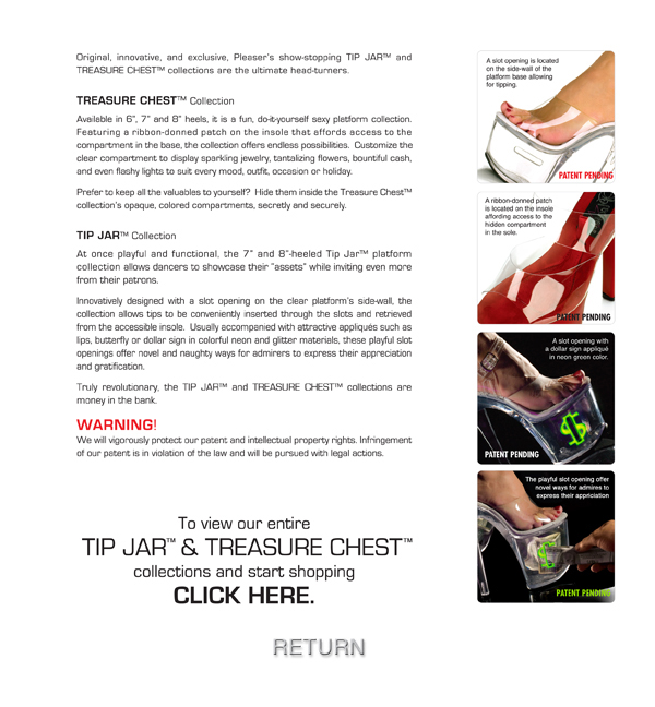 I have never seen a girl at my club wear these, but I think they're cute. My question is: how do you get the money out? Is there some kind of trap door? I cant imagine guys actually putting money in shoes as opposed to a g-string, but I figure if I can get the cash out then it would be a ideal place to keep money when I'm working because I hate carrying a little purse around. I have actually started wearing thigh highs and just putting the money in them. Does anyone else own a pair? Any suggestions? Thanks!