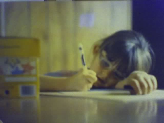 Pooka drawing in her dorky glasses....