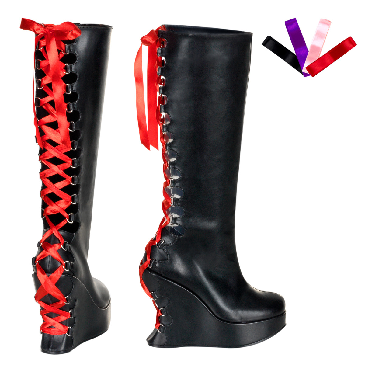 I need some ideas on putting together an outfit based around these boots (in picture) for a bartending position. I can't splurge on the nice black platform boots I want that would go with everything, so I have to work with what I got. Any ideas? I would like to wear some kind of nylon/fishnets with them also..