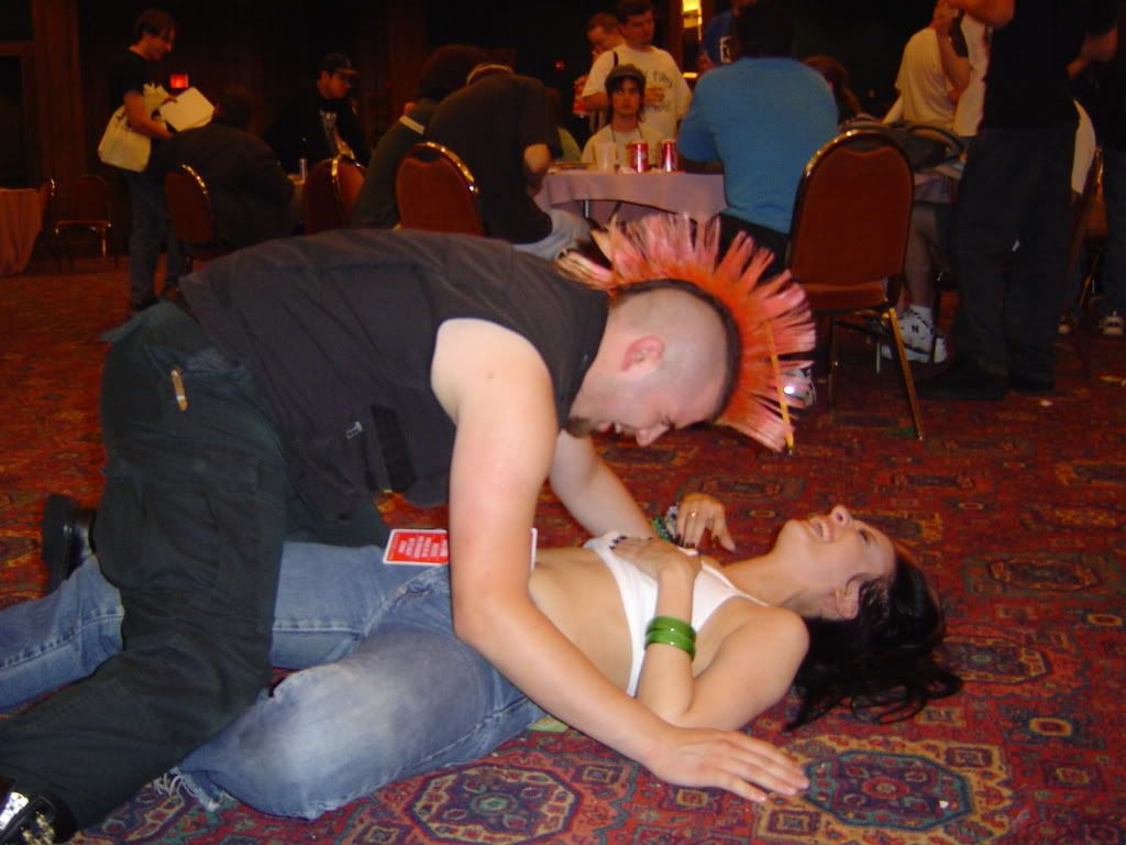ME at a con in Philly in 2000, watching in awe as Twin draws. I look brunette but I swear I was a redhead that year!