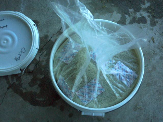 When dry canning with regular #10 cans you toss one in just before you seal on the lid and it will absorb all of the oxygen out of the can usually producing a small vacuum. I usually toss about 5 or 6 in each bucket as added insurance, with at least 2 or 3 of three of them in the bag to be vacuumed. In some of my later buckets I used 8 per bucket, with 3 in the bag and 5 tossed on top of the bag before the lid was hammered on. I actually found one of my stored buckets with the sides dramatically squeezed in from the internal vacuum, like it was being grabbed in three places by a giant hand.